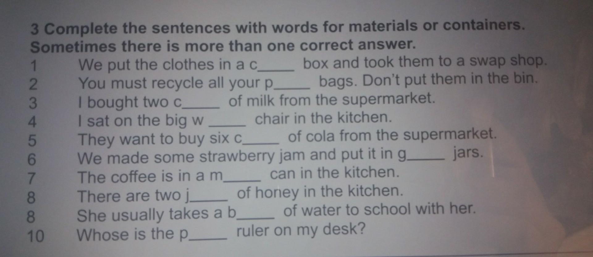 Ответ: cardboard ; plastic ; cartons ; wooden ; cans ; glass ; mug (?) ; jars ; bottle ; plastic (?)