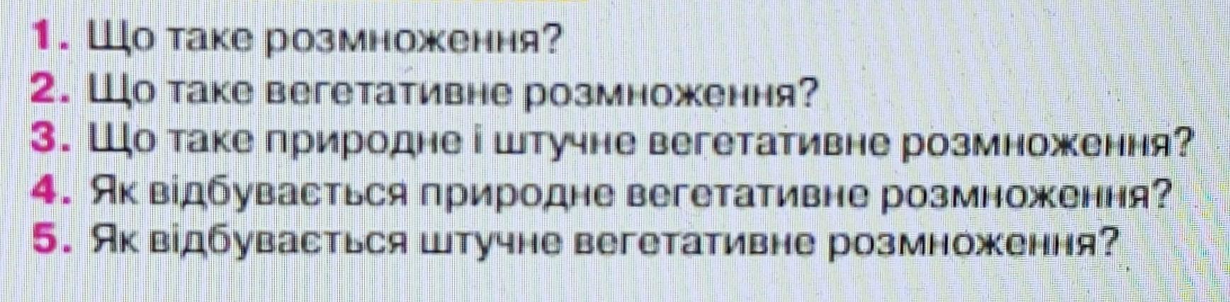 ЗАПИТАННЯ 1. Що таке розмноження? 2. Що таке вегетативне розмноження? 3. Що таке природне і штучне вегетативне розмноження? 4. Як відбувається природне вегетативне розмноження? 5. Як відбувається штучне вегетативне розмноження?