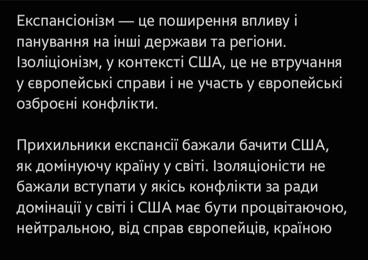У чому полягала відмінність позицій між прихильниками експансіонізму й ізоляціонізму в зовнішній політиці США?