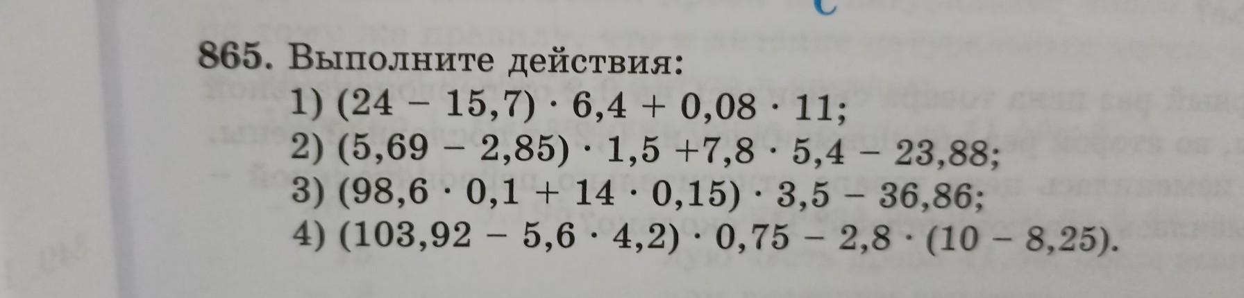 865. Выполните действия: 1) (24 - 15,7)- 6,4 +0,08 - 11; 2) (5,69- 2,85) 1,5 +7,8-5,4 - 23,88; * 3) (98,6-0,1 +14-0,15) - 3,5 - 36,86; 4) (103,92-5,6-4,2) 0,75-2,8 (10 - 8,25).