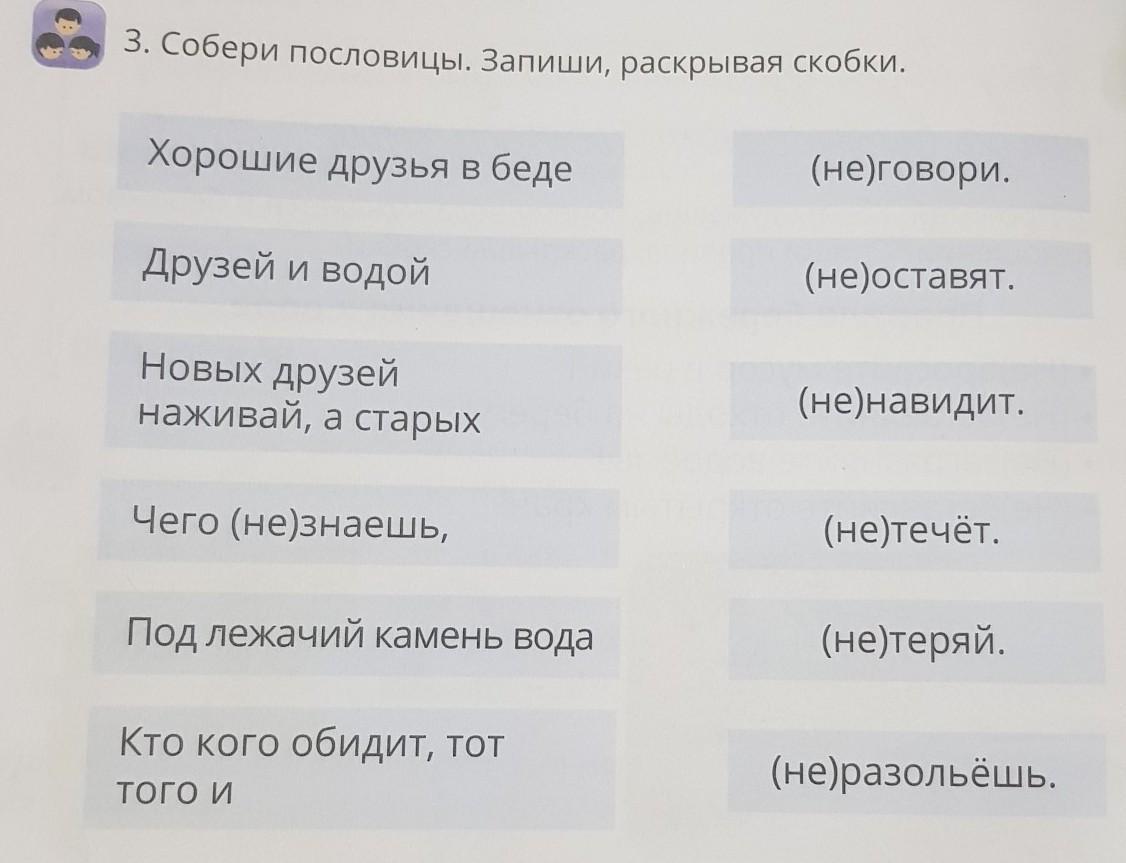 3. Собери пословицы. Запиши, раскрывая скобки. Хорошие друзья в беде Друзей и водой Новых друзей наживай, а старых Чего (не)знаешь, Под лежачий камень вода Кто кого обидит, тот того и (не)говори. (не)оставят. (не)навидит. (не)течёт. (не)теряй. (не)разольёшь.