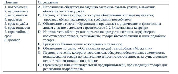 1. потребитель Е.2. изготовитель Н. 3. исполнитель С.4. продавец F. 5. срок службы G.6. срок годности D. 7. гарантийный срок В. 8. договор А.
