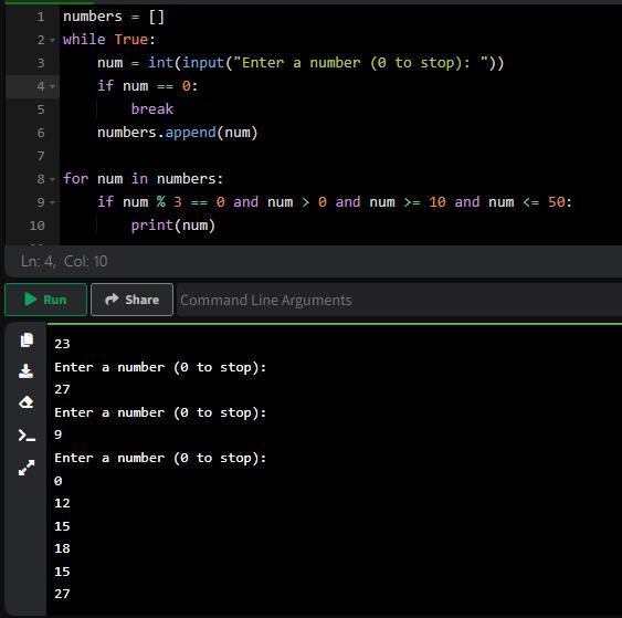 if num % 3 == 0 and num > 0 and num >= 10 and num <= 50: