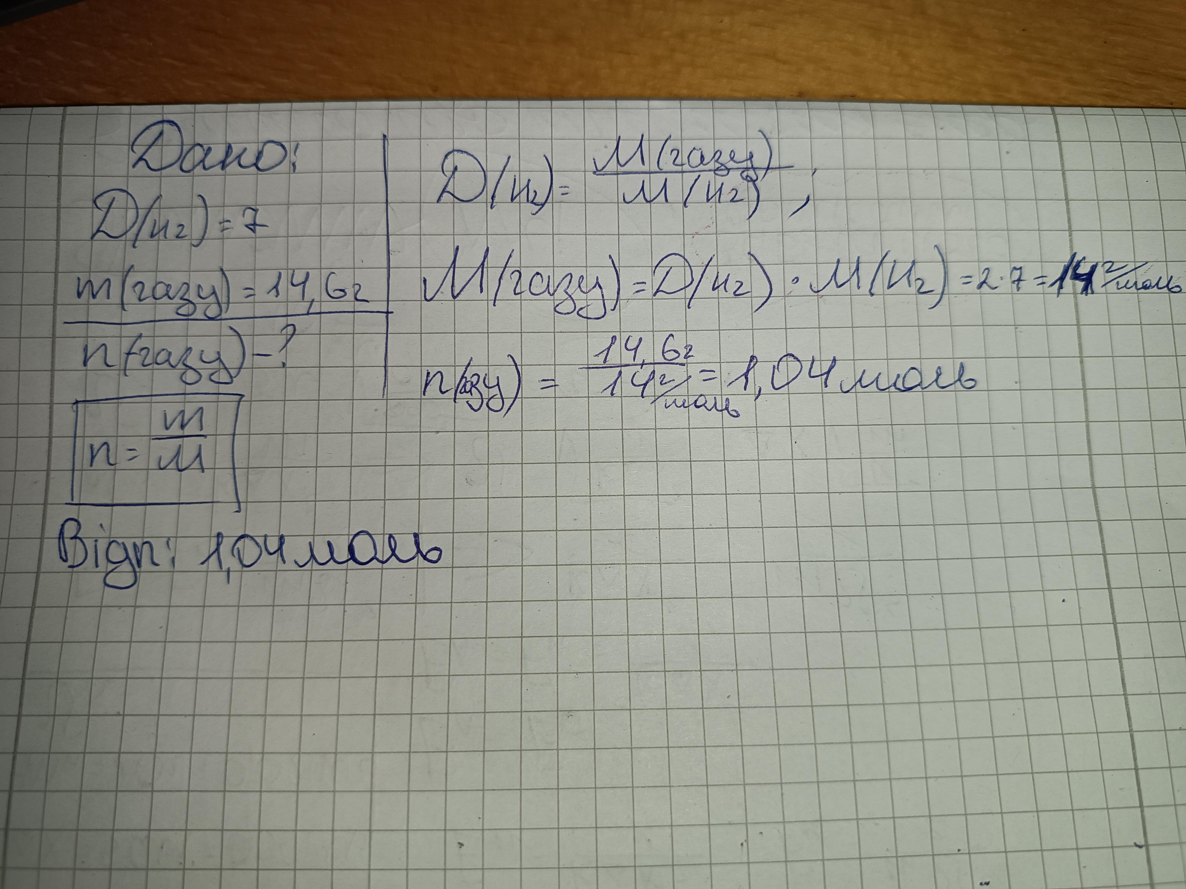 ПОМОГИТЕ ПОЖАЛУЙСТА СРОЧНО!!!!!!!!!! обчислити кількість речовини газу відносна густина якого за воднем становить 7 якщо маса цього газу дорівнює 14 г (с решением пожалуйста)