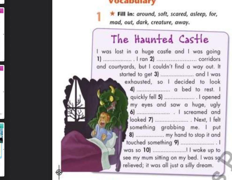 I was lost in a huge castle and I was going 1) mad. I ran 2) away through corridors and courtyards, but I couldn't find a way out. It started to get 3) dark and I was exhausted, so I decided to look 4) for a bed to rest. I quickly fell 5) asleep. I opened my eyes and saw a huge, ugly 6) creature. I screamed and looked 7) around. Next, I felt something grabbing me. I put 8) out my hand to stop it and touched something 9) soft. I was so 10) scared! I woke up to see my mum sitting on my bed. I was so relieved; it was all just a silly dream