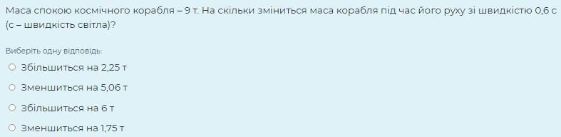 Маса спокою космічного корабля – 9 т. На скільки зміниться маса корабля під час його руху зі швидкістю 0,6 с (с – швидкість світла)?
