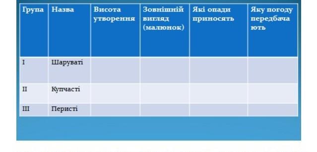 Шаруваті—висота до 2км,шаруваті-купчасті,передбачають дрбний дощ та слабкий сніг,зумовлюють хмарність та опади;Купчасті—висота 5-8км,мають вигляд вежі чи купола,приносять опади та велику хмарність,зумовлюють зливи,грози й град;Перисті— на висоті 6-10 км,перисті,ніяких,є придвісгиками зміни погоди