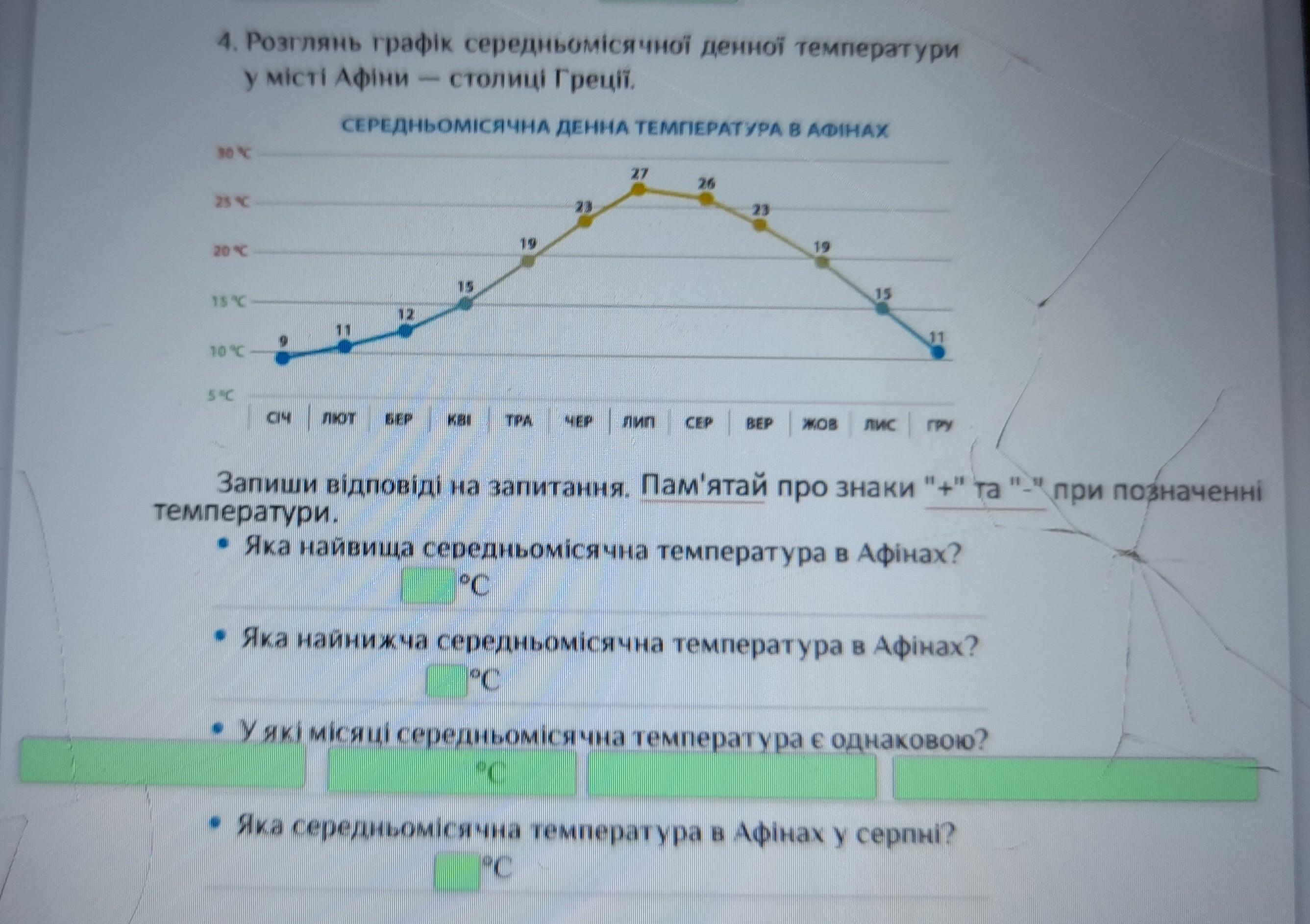 4. Розглянь графік середньомісячноï денноï температури у місті Афіни - столиці Греції. СЕРЕДНЬОМIСЯЧНА ДЕННА ТЕМПЕРАТУРА В АФІНАХ 30 25 % 20 ℃ 15 C 10°℃ CIM лкот 12 кир 23 27 PO 26 с 19 mindigt bra Ling 15 11 Запиши відповіді на запитання. Пам'ятай про знаки "+" та температури. • Яка найвища середньомісячна температура в Афінах? °С ЧЕК ЛИП CEP BEP 02 лис ГРУ • Яка найнижча середньомісячна температура в Афінах? С • У які місяці середньомісячна температура є однаковою? "C • Яка середньомісячна температура в Афінах у серпні? при позначенні