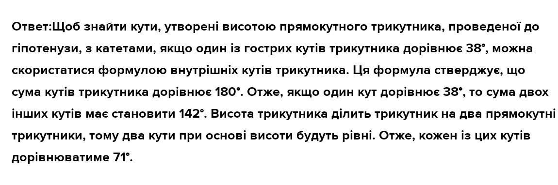 Знайдіть кути , які утворює висота прямокутнього трикутника, проведена до гіпотенузи, з катетами, якщо один з гострих кутів трикутника дорівнює 38°.