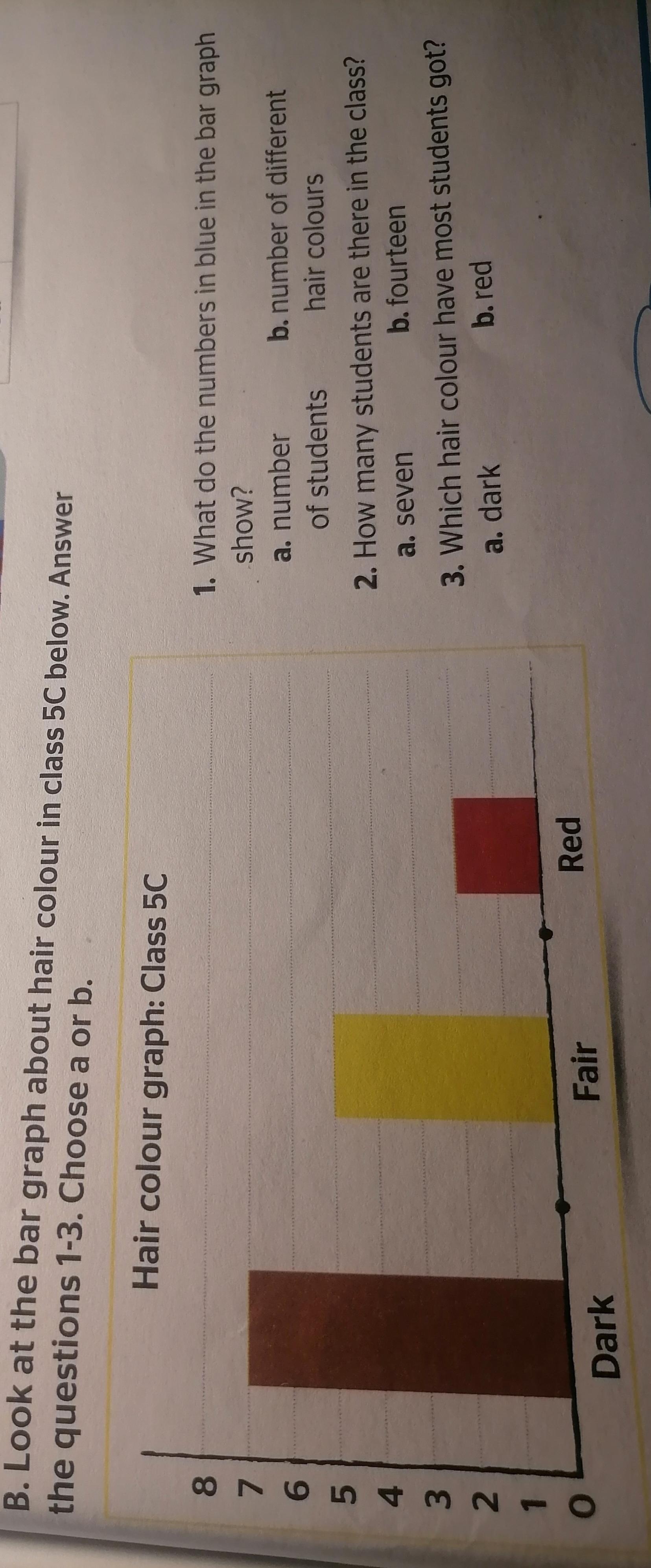 Look at the bar graph about hair colour in class 5C below. Answer the questions 1-3. Choose a or b.