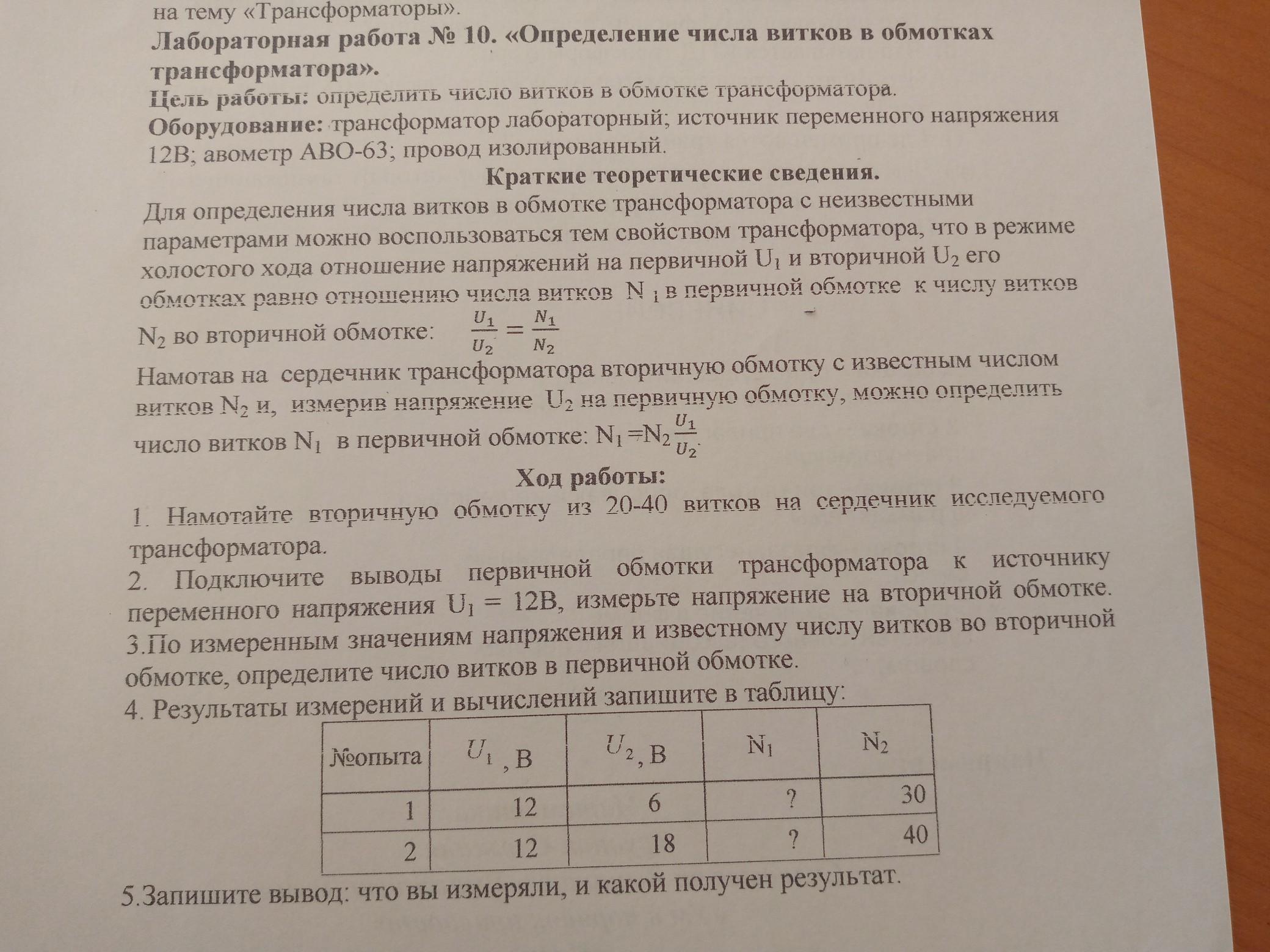 Лабораторная работа № 10. Определение числа витков в обмотках трансформатора». Цель работы: определить число витков в обмотке трансформатора. Оборудование: трансформатор лабораторный; источник переменного напряжения 12В; авометр ABO-63; провод изолированный. Краткие теоретические сведения. Для определения числа витков в обмотке трансформатора с неизвестными параметрами можно воспользоваться тем свойством трансформатора, что в режиме холостого хода отношение напряжений на первичной U, и вторичной U2 его обмотках равно отношению числа витков N, в первичной обмотке к числу витков U1 N1 N2 во вторичной обмотке: = U2 N2 U₁ Намотав на сердечник трансформатора вторичную обмотку с известным числом витков N2 и, измерив напряжение U2 на первичную обмотку, можно определить число витков N1 в первичной обмотке: N1=N2 U2 Ход работы: 1. Намотайте вторичную обмотку из 20-40 витков на сердечник исследуемого трансформатора. 2. Подключите выводы первичной обмотки трансформатора к источнику переменного напряжения U1=12в, измерьте напряжение на вторичной обмотке. 3.По измеренным значениям напряжения и известному числу витков во вторичной обмотке, определите число витков в первичной обмотке.
