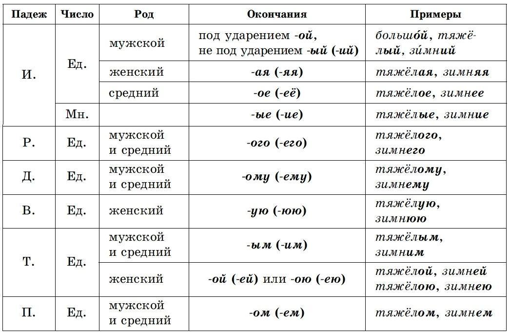 Окончания имени прилагательного зависит от падежа, рода и числа самого прилагательного. В таблице приведены окончания имён прилагательных в зависимости от рода, падежа и числа.