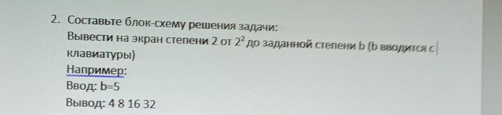 2. Составьте блок-схему решения задачи: Вывести на экран степени 2 от 2² до заданной степени ь (ь вводится с клавиатуры) Например: Ввод: b=5 Вывод: 4 8 16 32