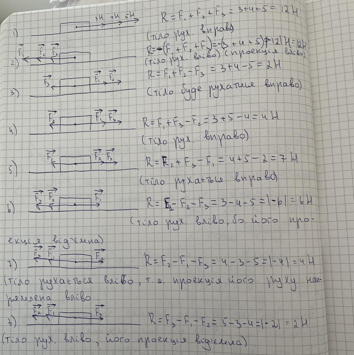 На тіло діють три сили вздовж однієї прямої: 3Н, 5Н, 4Н. Чому дорівнює рівнодійна сил? Напишіть всі можливі розв’язки. Зробіть пояснювальні малюнки.
