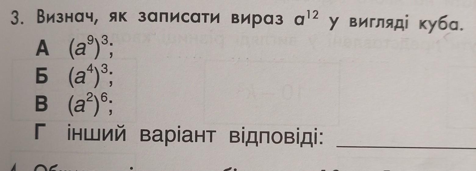 3. Визнач, як записати вираз a12 у вигляді куба. A (a)3, Б (21)3; B (a²)6; Г інший варіант відповіді: