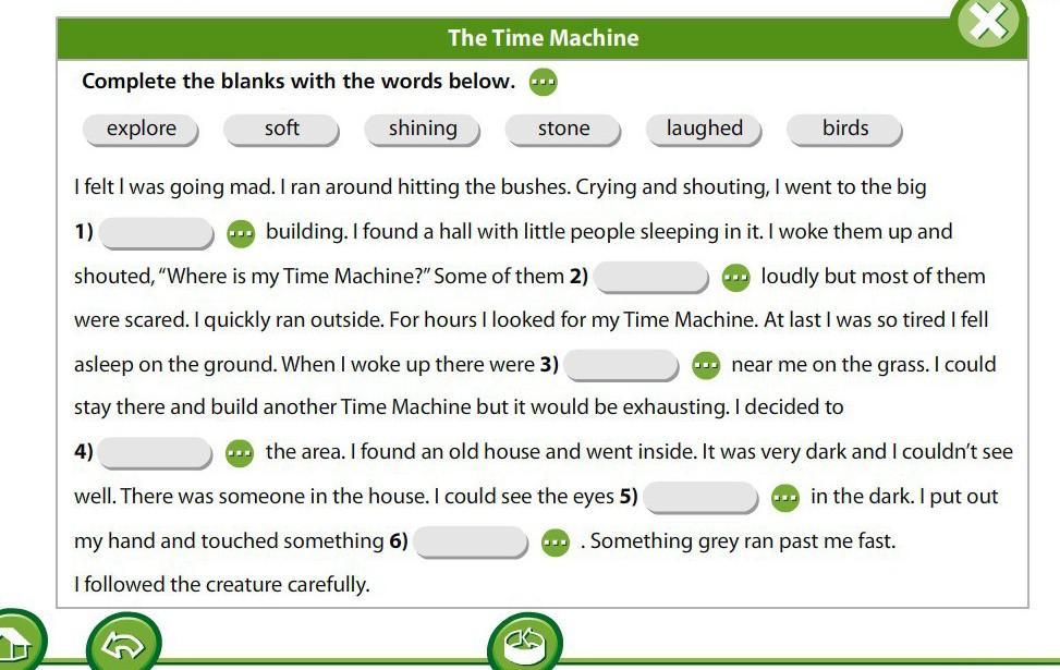 The Time Machine Complete the blanks with the words below... explore shining soft stone laughed birds X I felt I was going mad. I ran around hitting the bushes. Crying and shouting, I went to the big 1) ...building. I found a hall with little people sleeping in it. I woke them up and loudly but most of them shouted, "Where is my Time Machine?" Some of them 2) were scared. I quickly ran outside. For hours I looked for my Time Machine. At last I was so tired I fell asleep on the ground. When I woke up there were 3) near me on the grass. I could stay there and build another Time Machine but it would be exhausting. I decided to 4) well. There was someone in the house. I could see the eyes my hand and touched something 6) I followed the creature carefully. the area. I found an old house and went inside. It was very dark and I couldn't see in the dark. I put . Something grey ran past me fast.