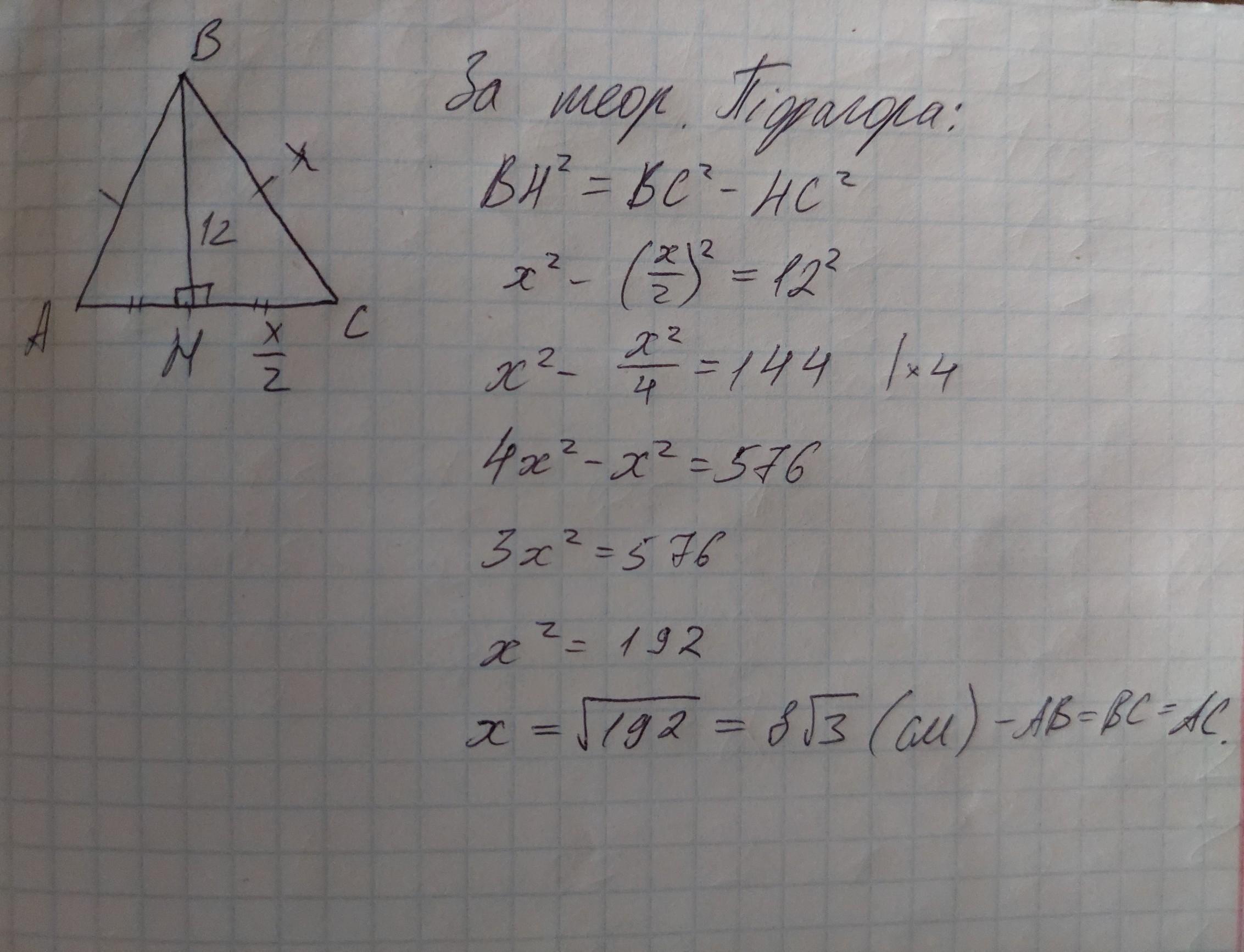 12 : 3 = 4 см дорівнює сторона трикутника(як і всі інші)