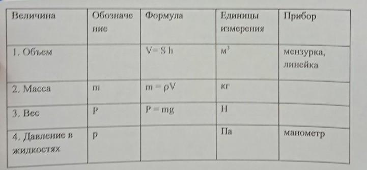 Величина 1. Объем 2. Macca 3. Вес 4. Давление в жидкостях Обозначе ние m P р Формула V=Sh m=pV P = mg Единицы измерения 3 M КГ Н Па Прибор мензурка, линейка манометр