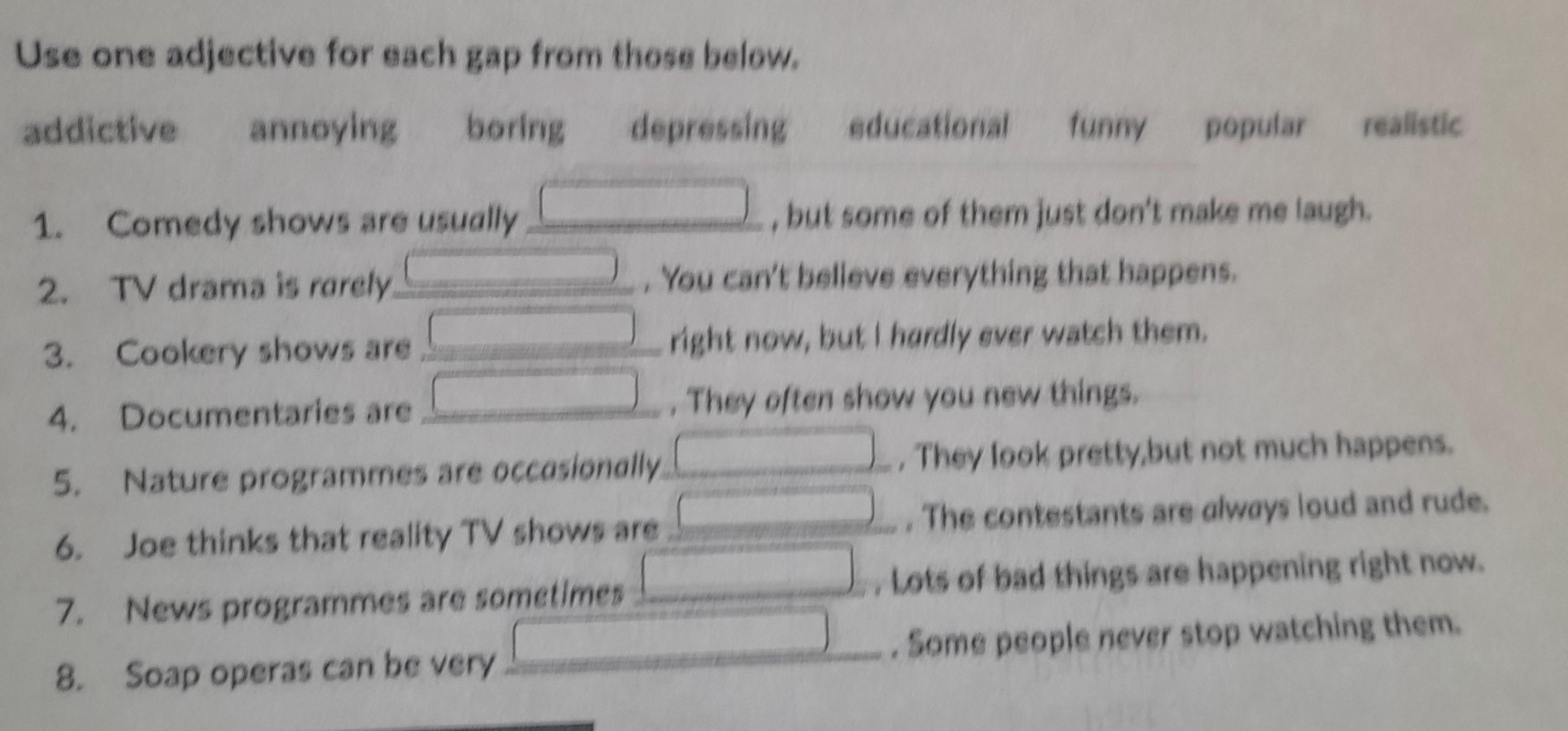 Use one adjective for each gap from those below. addictive annoying boring depressing 1. Comedy shows are usually 2. TV drama is rarely. Cookery shows are Documentaries are 3. 4. 5. 6. 7. 8. educational funny popular realistic but some of them just don't make me laugh. You can't believe everything that happens. right now, but I hardly ever watch them. They often show you new things. Nature programmes are occasionally Joe thinks that reality TV shows are News programmes are sometimes Soap operas can be very . They look pretty,but not much happens. The contestants are always loud and rude. Lots of bad things are happening right now. . Some people never stop watching them.