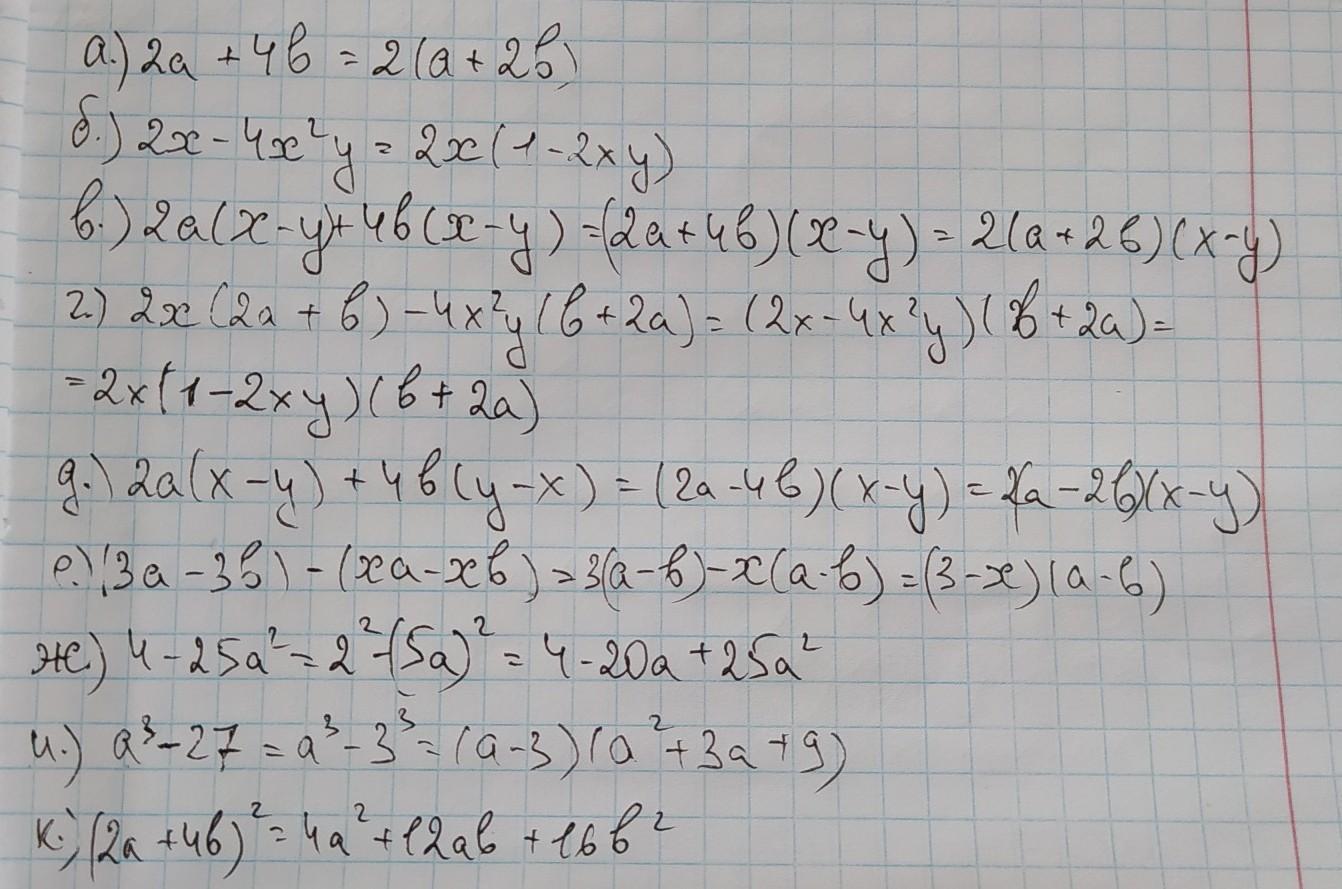 2.Разложите на множители выражение: A) 2a+4 b; Б) 2x-4х²у; B) 2a(x-y)+4b(x-y); Г) 2x(2a +b) -4x²y(b+2а); Д) 2а(x-y)+4b(y-x); E) (3а-3 b)- (ха-xb); Ж) 4-25a²; И) a³- 27; К) (2a+4 b)². СРОЧНООО ПОЖАЛУЙСТА