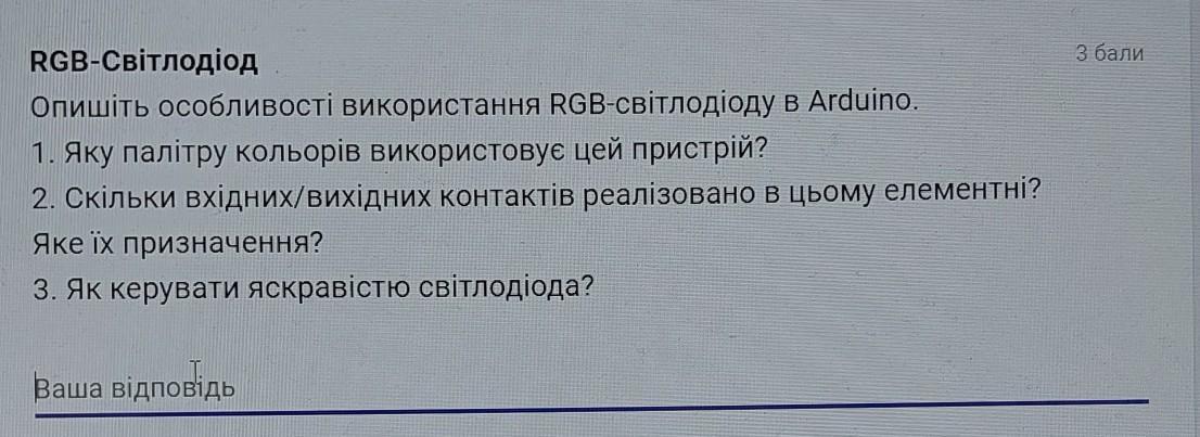 RGB-Світлодіод Опишіть особливості використання RGB-світлодіоду 1. Яку палітру кольорів використовує цей пристрій? 2. Скільки вхідних/вихідних контактів реалізовано в цьому елементні? Яке їх призначення? 3. Як керувати яскравістю світлодіода? в Arduino. 3. Як керувати яскравістю світлодіодів?