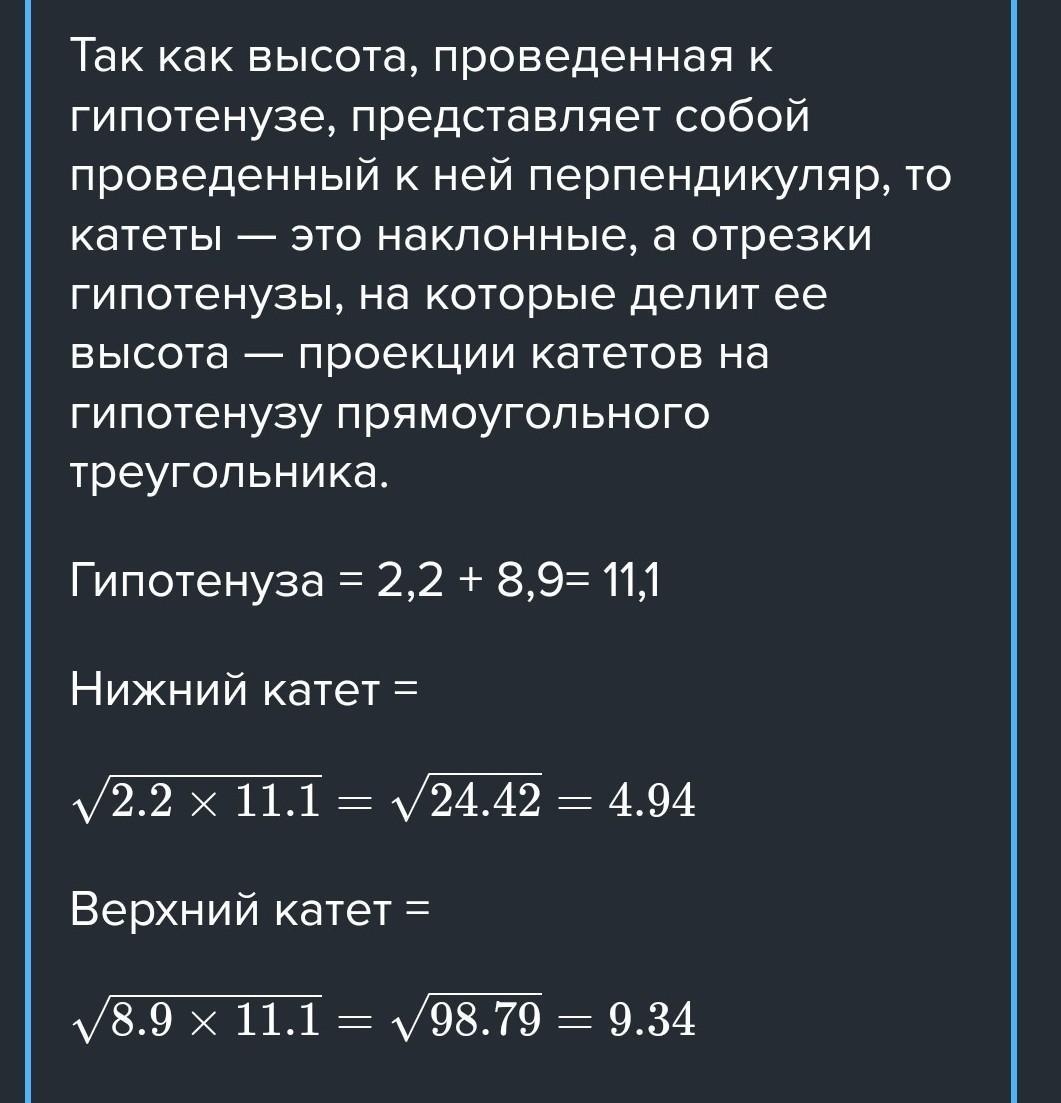 Знайти катети прямокутного трикутника, якщо проєкції катетів на гіпотенузу дорівнюють 1,6 см і 0.9см