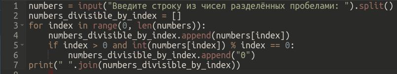 На вход подается строка, содержащая целые числа, записанные через пробел. Требуется превратить строку в список и преобразовать его, вставив число ноль после всех элементов, кратных своему индексу. Необходимо вывести элементы преобразованного списка через пробел.