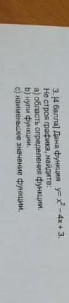 3. [4 балла] Дана функция у= х² - 4х+3. Не строя графика, найдите: а) область определения функции. b) нули функции. 4)