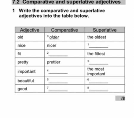 1 the nicest 2 fitter 3 the prettiest 4 more important 5 more beautiful 6 the most beautiful 7 better 8 the best