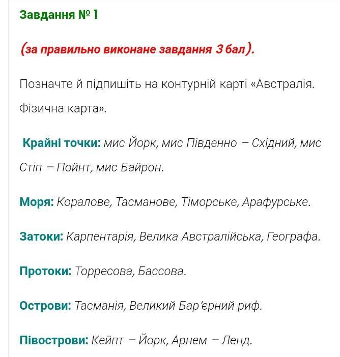 Завдання № 1 (за правильно виконане завдання з бал). Позначте й підпишіть на контурній карті «Австралія. Фізична карта». - Крайні точки: мис Йорк, мис Південно — Східний, мис Стіп - Пойнт, мис Байрон. Моря: Коралове, Тасманове, Тіморське, Арафурське. Затоки: Карпентарія, Велика Австралійська, Географа. Протоки: Торресова, Бассова. Острови: Тасманія, Великий Бар'єрний риф. Півострови: Кейпт - Йорк, Арнем - Ленд.