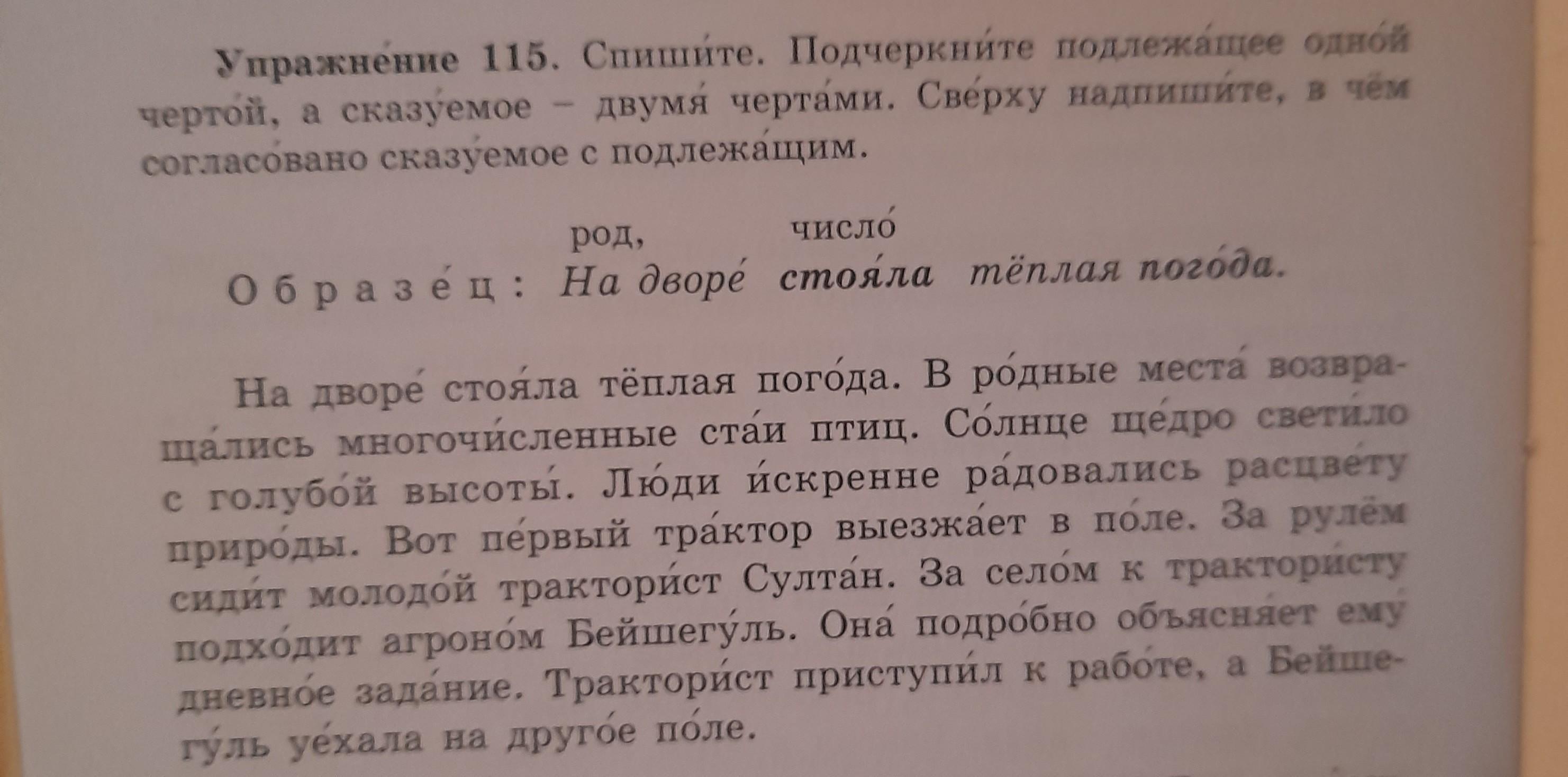 На дворе стояла теплая погода. ( Стояла-сказуемое , погода-подлежащее ) В родные места возвращались многочисленные стаи птиц. ( Возвращались- сказуемое, стаи- подлежащее ) Солнце щедро светило с голубой высоты. ( Солнце- подлежащее, светило- сказуемое ) Люди искренне радовались расцвету природы. ( Люди- подлежащее, радовались- сказуемое ) Вот первый трактор выезжает в поле. ( Трактор- подлежащее, выезжает- сказуемое ) За рулём сидит молодой тракторист Султан. ( Султан- подлежащее, сидит- сказуемое ) За селом к трактористу подходит агроном Бейшегуль. ( Бейшегуль- подлежащее, подходит- сказуемое ) Она подробно объясняет ему дневное задание. ( Она- подлежащее, объясняет- сказуемое ) Тракторист приступил к работе, а Бейшегуль уехала на другое поле. ( Тракторист, Бейшегуль- подлежащее, приступил,уехала- сказуемое