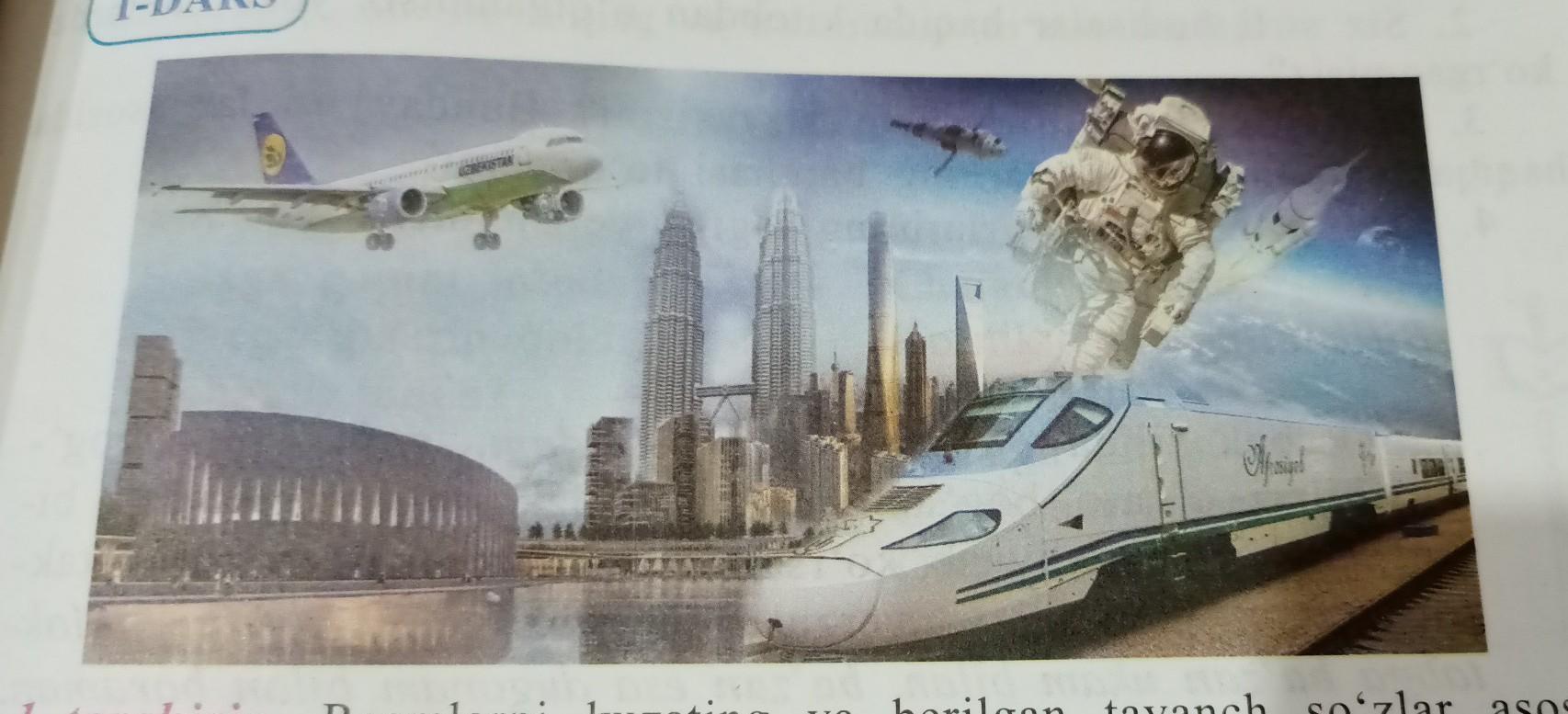 1-DARS 1-topshiriq. Rasmlarni kuzating va berilgan tayanch so'zlar asosida gaplar tuzing. Namuna: Osmonda yulduzlar chaqnab turibdi... Tayanch so'z va birikmalar: yulduz, chaqnamoq, samolyot, uchmoq, osmono'par binolar, tezyurar poyezdlar, bugungi taraqqiyot, kompyuter imkoniyatlari, bilimlarni egallash.