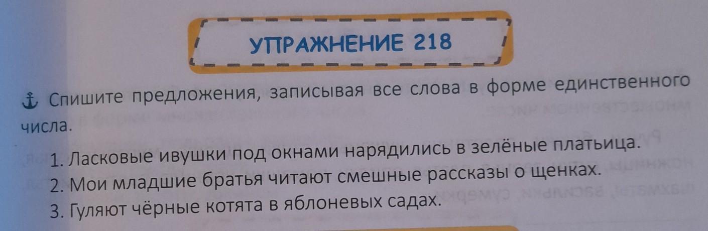 УПРАЖНЕНИЕ 218 Спишите предложения, записывая все слова в форме единственного числа. 1. Ласковые ивушки под окнами нарядились в зелёные платьица. 2. Мои младшие братья читают смешные рассказы о щенках. 3. Гуляют чёрные котята в яблоневых садах.