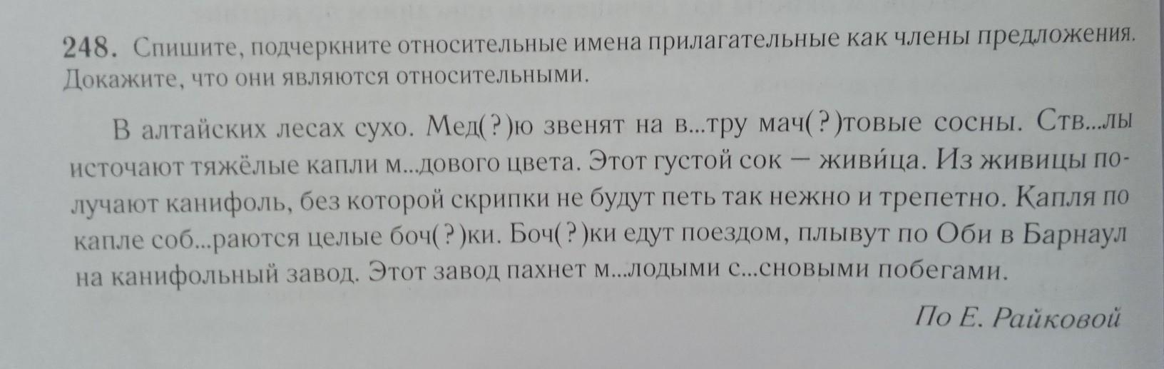 248. Спишите, подчеркните относительные имена прилагательные как члены предложения. Докажите, что они являются относительными. В алтайских лесах сухо. Мед(?)ю звенят на .....тру мач(?)товые сосны. Ств..лы источают тяжёлые капли м...дового цвета. Этот густой сок - живица. Из живицы по- лучают канифоль, без которой скрипки не будут петь так нежно и трепетно. Капля по капле соб...раются целые боч( ? )ки. Боч(?)ки едут поездом, плывут по Оби в Барнаул на канифольный завод. Этот завод пахнет м...лодыми ...новыми побегами. По Е. Райковой