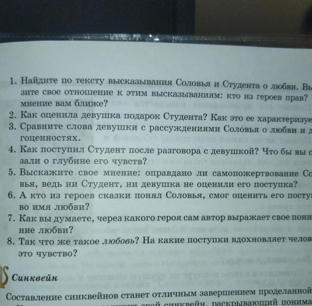 1. Найдите по тексту высказывания Соловья и Студента о любви. Выра- зите свое отношение к этим высказываниям: кто из героев прав? Чье мнение вам ближе, 2. Как оценила девушка подарок Студента? Как это ее характеризует? 3. Сравните слова девушки с рассуждениями Соловья о любви и дра- гоценностях. 4. Как поступил Студент после разговора с девушкой? Что бы вы ска- зали о глубине его чувств? 5. Выскажите свое мнение: оправдано ли самопожертвование Соло- вья, ведь ни Студент, ни девушка не оценили его поступка? 6. А кто из героев сказки понял Соловья, смог оценить его поступок во имя любви? 7. Как вы думаете, через какого героя сам автор выражает свое понима- ние любви? 8. Так что же такое любовь? На какие поступки вдохновляет человека это чувство?