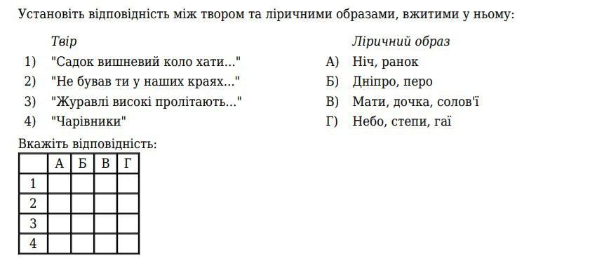 Установіть відповідність між твором та ліричними образами, вжитими у ньому: Ліричний образ Нiч, ранок Дніпро, перо В) Мати, дочка, солов'ї Г) Небо, степи, гаї Твір 1) 2) "Садок вишневий коло хати..." "Не бував ти у наших краях..." 3) "Журавлі високі пролітають..." 4) "Чарiвники" Вкажіть відповідність: АБВГ 1 2 34 3 A) Б)