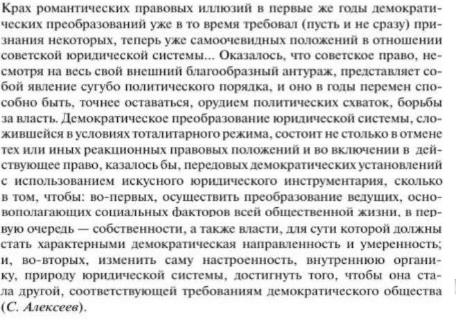 2) По мнению автора, крах романтических правовых иллюзий в первые годы демократических реформ был обусловлен тем, что советское право оказалось сугубо политическим явлением, способным быть орудием политических схваток и борьбы за власть.