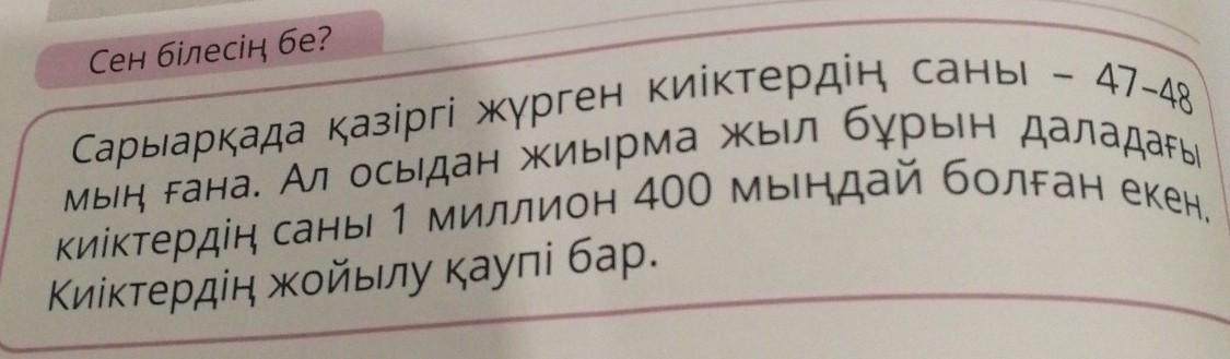 Сен бiлесiң бе? Сделать вопросы! Сарыарқада қазіргі жүрген киiктердiн саны - 47-48 киіктердің саны 1 миллион 400 мыңдай болған екен. мың ғана. Ал осыдан жиырма жыл бұрын даладағы Киіктердің жойылу қаупі бар.
