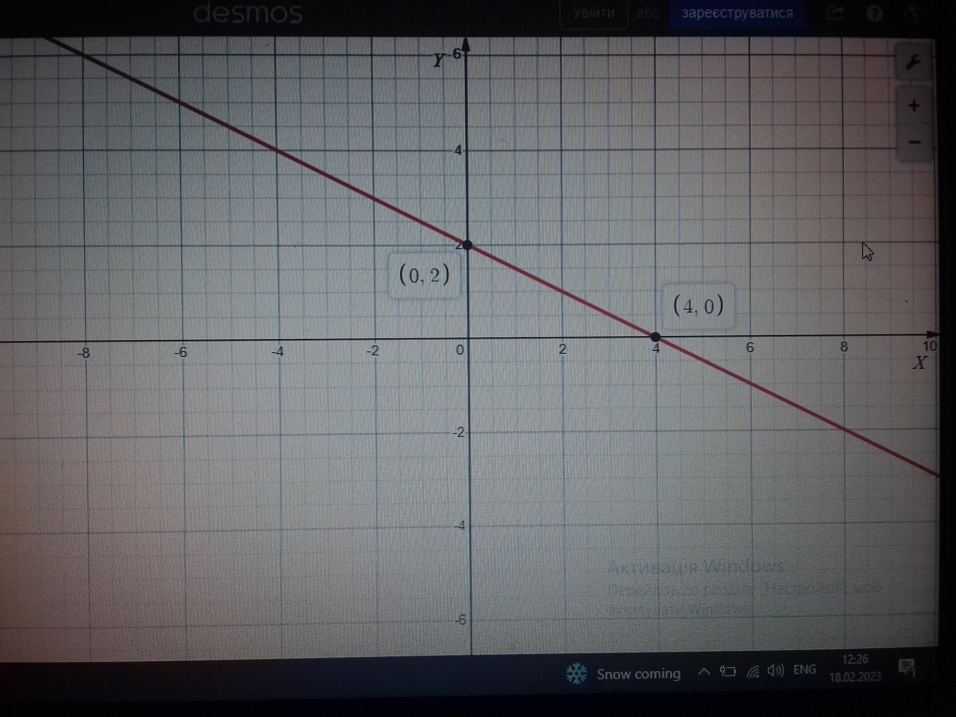 Якщо якась пряма перетинає вісь ОХ, то у точці перетину координата У = 0. Підставимо У = 0 до нашої функції та отримаємо: 0 = -0,5Х + 2. Звідки Х = -2 / ( -0,5 ) = 4. Отже друга точка перетину має координати ( 4, 0 ).