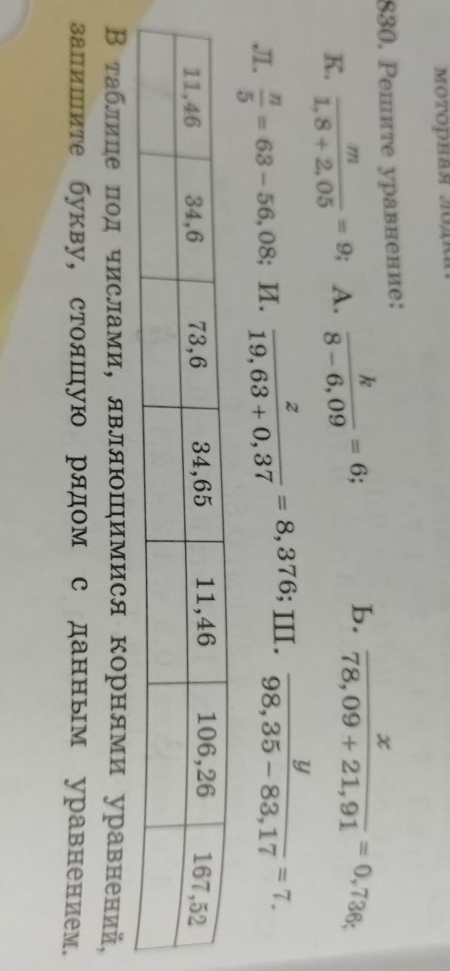 830. Решите уравнение: -- К. 13-2.05 л. 3- - 63-56,08 И. 19,63+0,37 11.46 =& A. 5-6.09 34,6 73,6 = 6: = 8,376; Ш. 34.65 11,46 78.09 +21,91 = 0,736 98,35-83,17 106,26 167,52 запишите букву, стоящую рядом с данным уравнением. В таблице под числами, являющимися корнями уравнений. S3 83 S СРОЧНО ДАМ 30Б