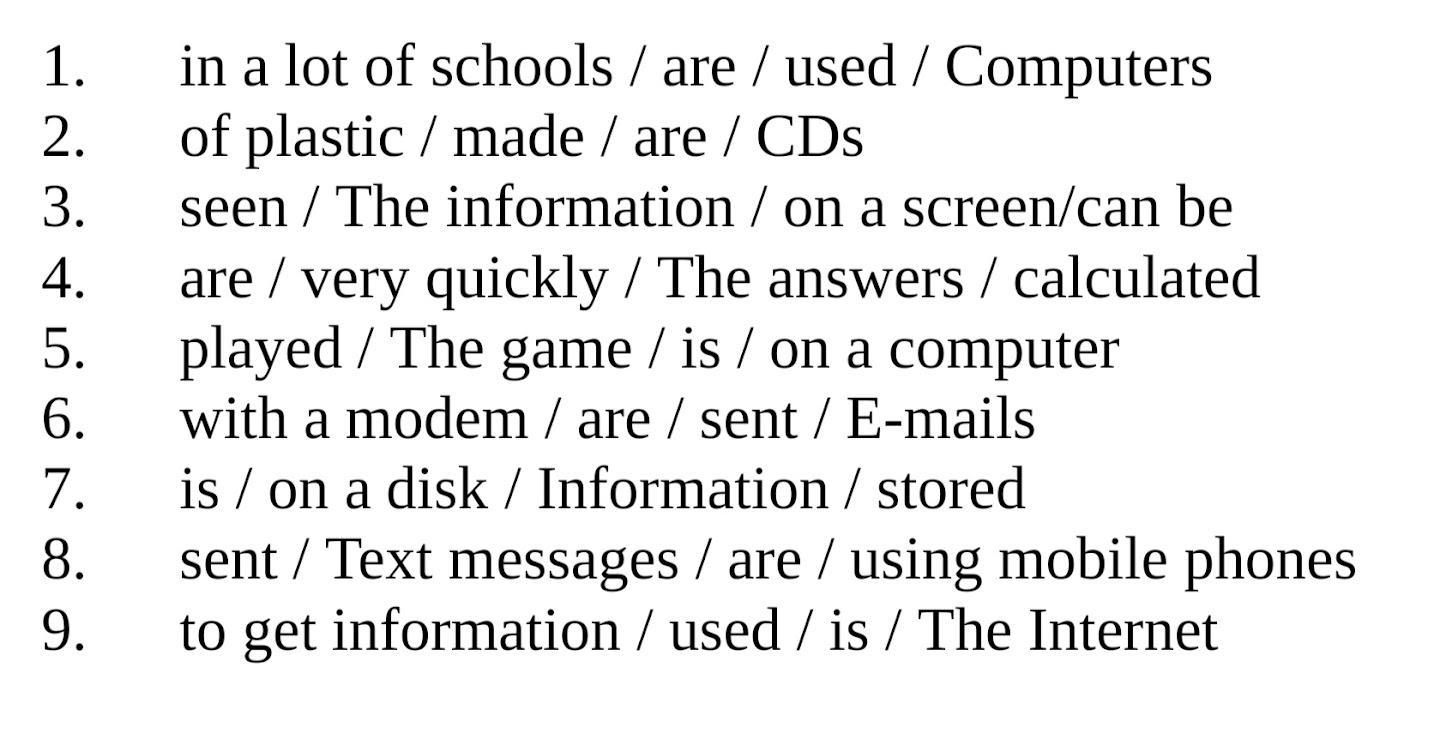 Ответ:Computers are used in a lot of schools. CDs are made of plastic. The information can be seen on a screen. The answers are calculated are very quickly. The game is played on a computer. E-mails are sent with a modem. Information is stored on a disk. Text messages are sent using mobile phones. The Internet is used to get information.
