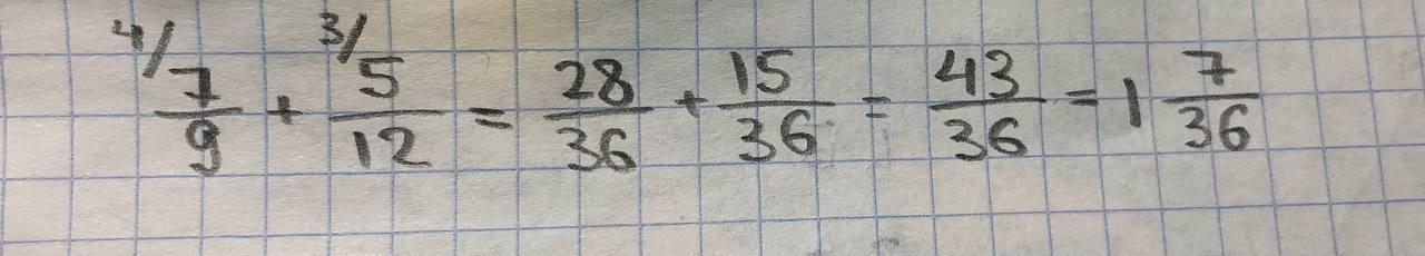 обёсняю 36 ставим в знаменник потому что это нск 9 и 12, 36÷9=4 4 ставим в 《додатковий множник》к 7/9, 36÷12=3 3 ставим также в додатковий множник только для 5/12 потом 7×4=28, 5×3=15 и плюсуем 28/36, 15/36 получаеться 43/36 (этто не правельний дроб) поетому переводим эго итог: 7/36