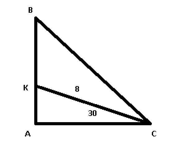 у прямокутному трикутнику гострий кут дорівнює 60°, а бісектриса цього кута 8см. Знайти довжину катета, який лежить проти цього кута