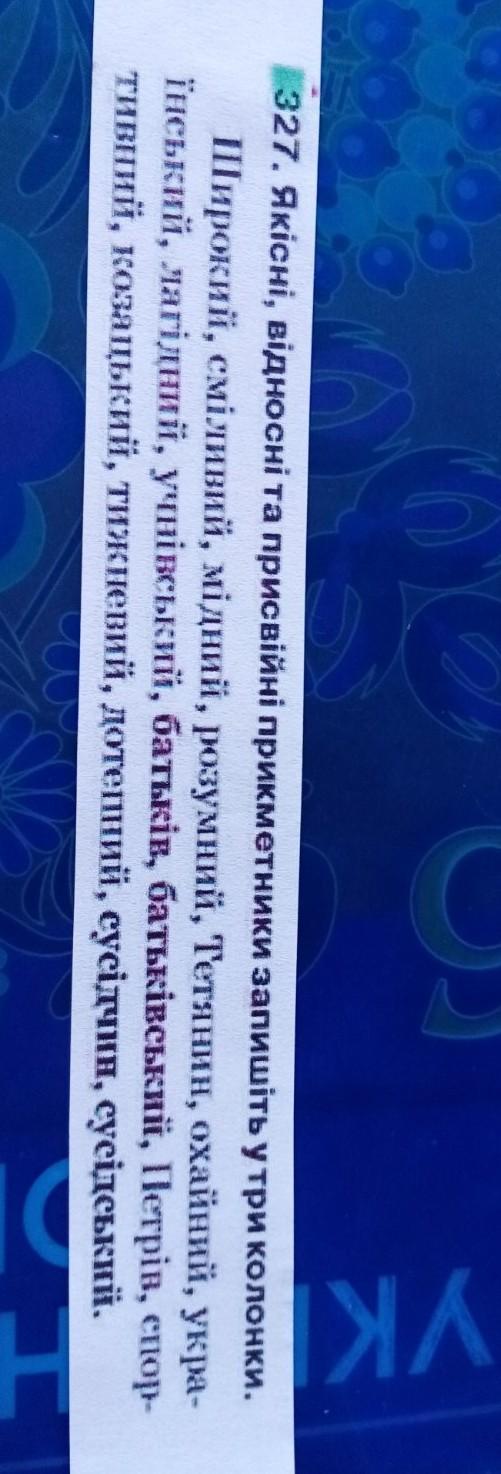 Відповідь:якісні:широкий,сміливий, розумний, охайний,лагідний,спортивний,дотепний відносні:мідний,український, учнівський,батьківський,тижневий, сусідський, козацький. присвійні:Тетянин, батьків , Петрів ,Сусідчин