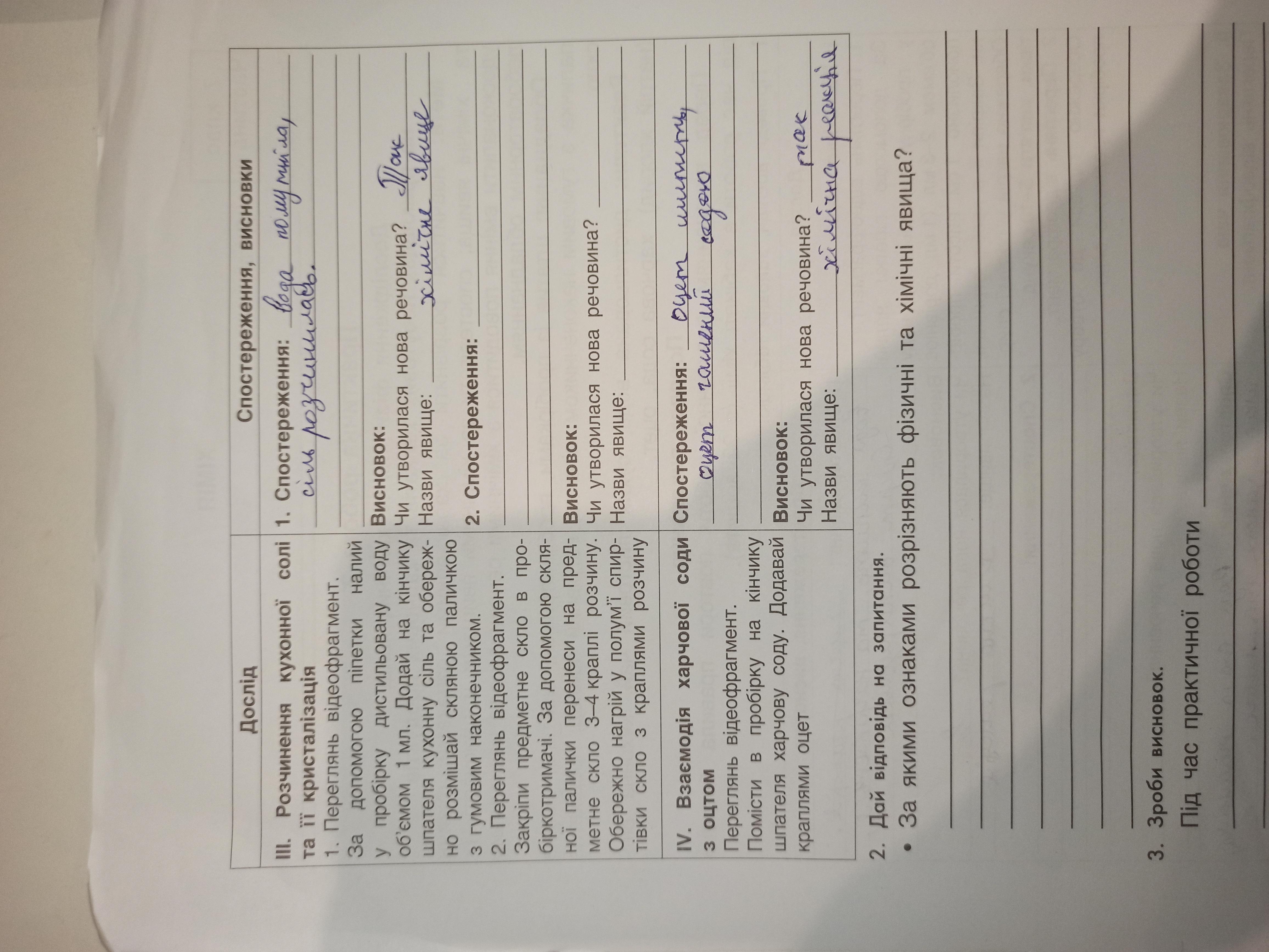воду Висновок: обʼємом 1 мл. Додай на кінчику Чи утворилася нова речовина? шпателя кухонну сіль та обереж- Назви явище: