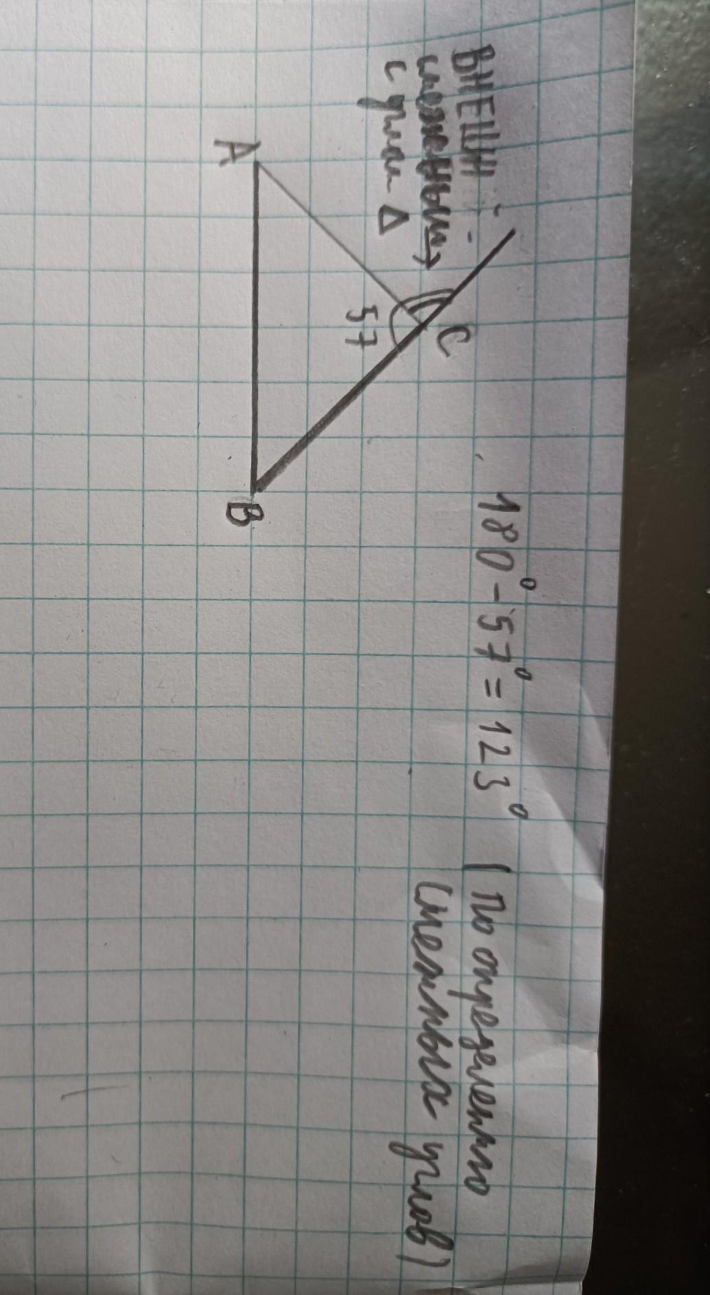 Знайдіть зовнішній кут трикутника АВС при вер- шині даного кута, якщо: 1) <А = 57°