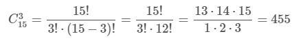 Елене из 15 тренажеров нужно выбрать 3, порядок выбора значения не имеет. Получается нужно найти число сочетаний из 15 элементов по 3.