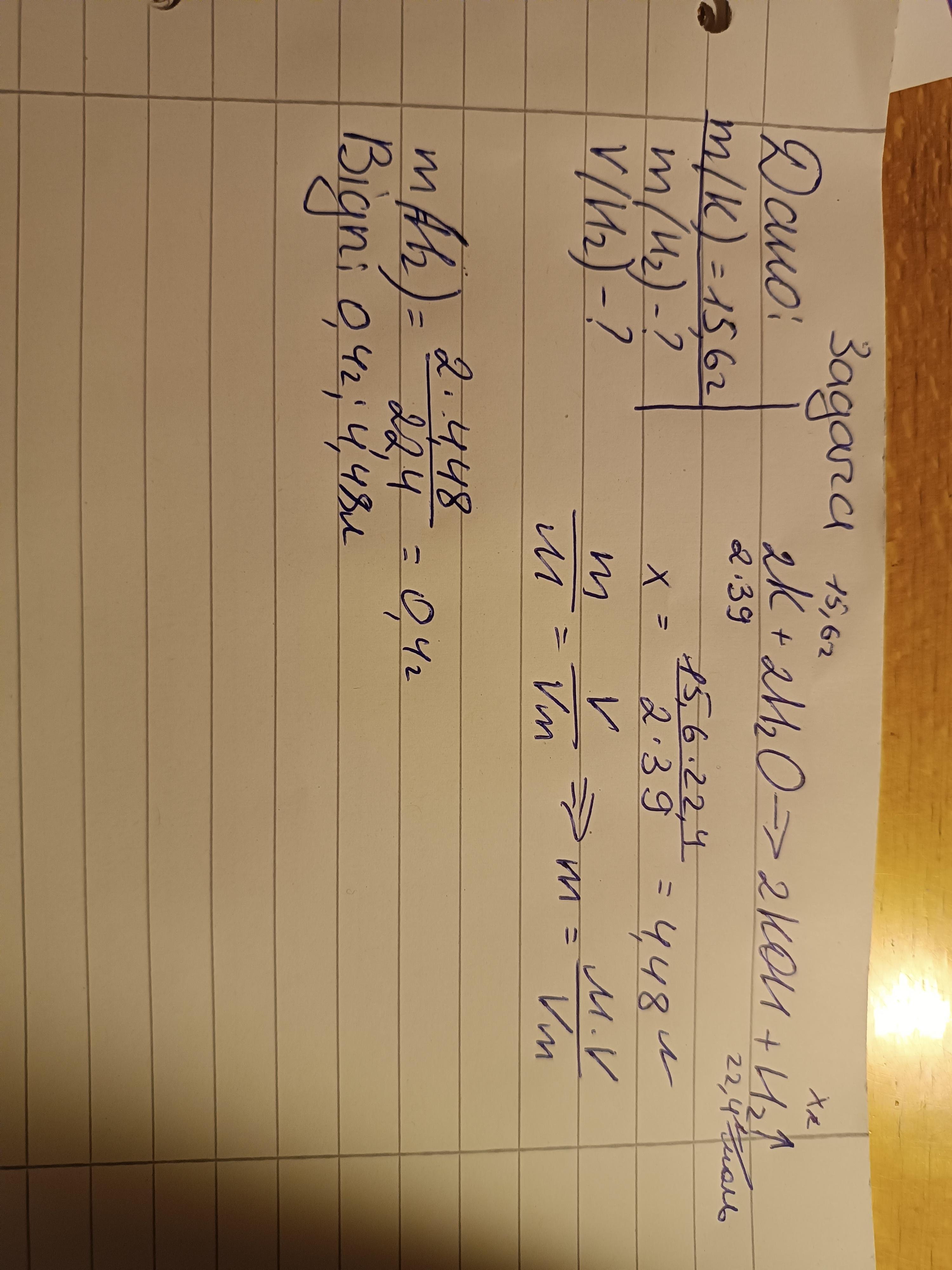 При взаємодії 15.6.грама калію з водою виділився водень . Обчисліть масу і об'єм водню? СРОЧНО!!!!!!!!!