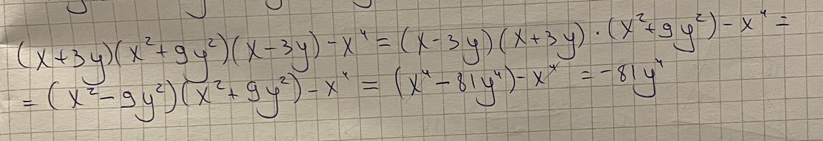 (x^2 - 9y^2)(x^2+9y^2) = x^4 - (9y^2)(x^2) + (9y^2)(x^2) - (9y^2)^2 = x^4 - 81y^4