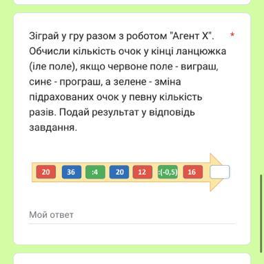 Зіграй у гру разом з роботом "Агент Х". Обчисли кількість очок у кінці ланцюжка (іле поле), якщо червоне поле - виграш, синє - програш, а зелене - зміна підрахованих очок у певну кількість разів. Подай результат у відповідь завдання.